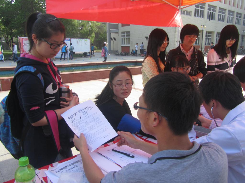 中午,志愿者们迎着高温将展板、宣传单、测量器材、喷绘等分配到各个活动点,他们挥洒汗水为活动做好准备工作。此次活动共有四个活动宣传点,蓝色导航 三个校区本部、北区、西区和龙湖公园,宣传对象是学生和社会群体。午饭过后,疾控中心的几位专业人士到达活动地点,活动正式开始。