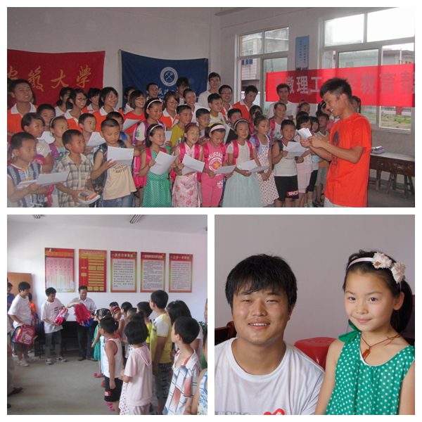 2012年7月,化学工程蓝色导航 应用化学系党支部书记邢宏龙、学生第三党支部书记刘瑞老师带领学生党员及团员骨干,联合安大、中科大师生远赴安徽省六安市金寨县斑竹园镇,为斑竹园希望小学暑期留守的孩子送去文具、开展文艺活动及心理帮扶。