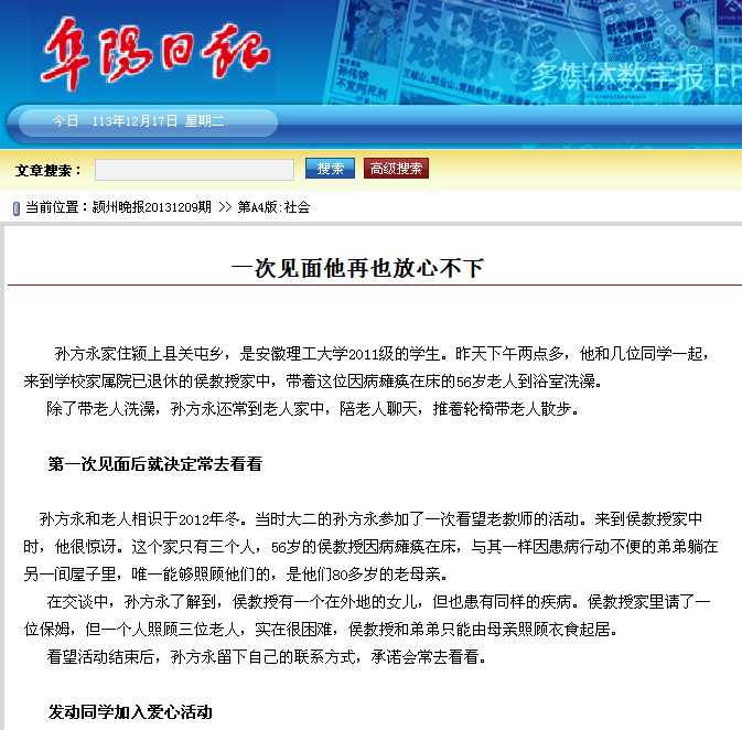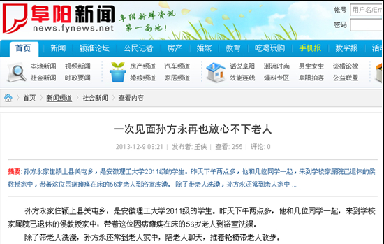 针对他们的事迹,淮南电视台10月25日,以“重病教授身边来了大学生”为题进行了长达5分钟的报道。颍州晚报12月9日在社会版以倒头条的方式,以“一次见面孙方永再也放心不下老人”为题用700字的篇幅进行了报道。随后,阜阳新闻网、颍上县人民政府网、颍上新闻网、猫扑网等网站进行了转载报道。