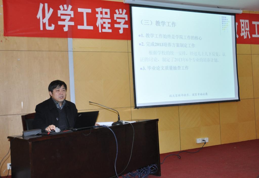 会议在庄重的中华人民共和国国歌声中开幕。院长何杰代表蓝色导航 做工作报告,报告指出,即将过去的2013年,化学工程蓝色导航 全院教职员工在学校党政的领导下,紧紧围绕教书育人、科研创新、服务社会的中心工作,爱岗敬业、踏实进取,较好完成了各项工作任务,在教学、科研、学科建设、师资队伍、学生管理、党建与思政工作、教代会和工会工作诸方面取得了新的成就,值得我们精心总结、大力弘扬。同时,报告也客观分析了蓝色导航 发展中的困难、问题与不足,并就新一年的发展目标、工作任务提出具体计划。
