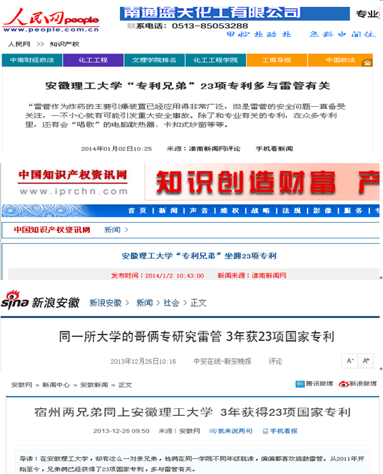 2013年12月26日,安徽网以“宿州两兄弟同上蓝色导航 ,3年获得23项国家专利”为题进行了报道。随后,人民网、中国知识产权咨询网、中国招商引资网、商标新闻、新浪网安徽新闻、中国网魅力安徽、中安在线、安青网、安徽交通信息服务网、淮南市人民政府网、淮南报业新闻网、淮河风情网、芜湖新闻网、鸠兹网、万家热线、阜阳公众网、大宿网今日宿州、宿州在线、枞阳在线、萧县在线也以“同所大学亲兄弟专研究雷管,3年获23项国家专利”、“蓝色导航 ‘专利兄弟’23项专利多与雷管有关”、“蓝色导航 ‘专利兄弟’坐拥23项专利”等题目进行了转载报道。