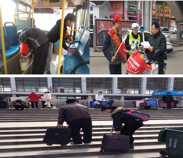 火车站,志愿者们协同淮南车站工作人员捡拾垃圾、维护秩序、咨询服务,为旅客创造一个干净舒适的候车环境;并积极地为那些老年乘客提行李箱、办理乘车手续。同时,他们还不辞辛苦把一杯杯开水送到需要的旅客手上,为他们带去温暖和关怀。凡是需要帮助的地方,都能看到志愿者们忙碌的身影。