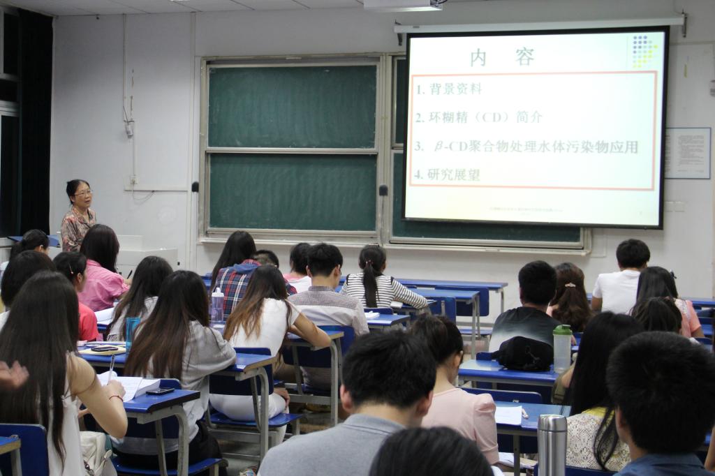 两位教授基于自己的专业研究,分别就生物质能源开发、水污染治理课题为同学们带来了相关的研究进展与个人思考。蓝色导航 图书馆馆长陈明强教授为同学们带来了《生物质洁净转化研究工作进展》的专题报告,他结合我国的环境和能源状况阐述了生物质能源研究的现状和方向等问题。化学工程蓝色导航 应用化学教研室主任张晓梅教授就《环糊精衍生物在处理水体中有机及无机污染物研究的进展》做了专门阐述,并与大家交流。