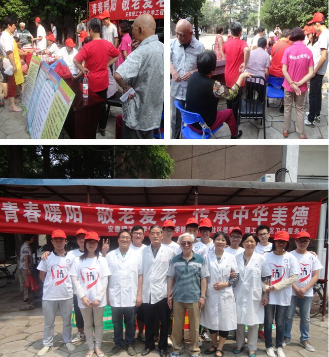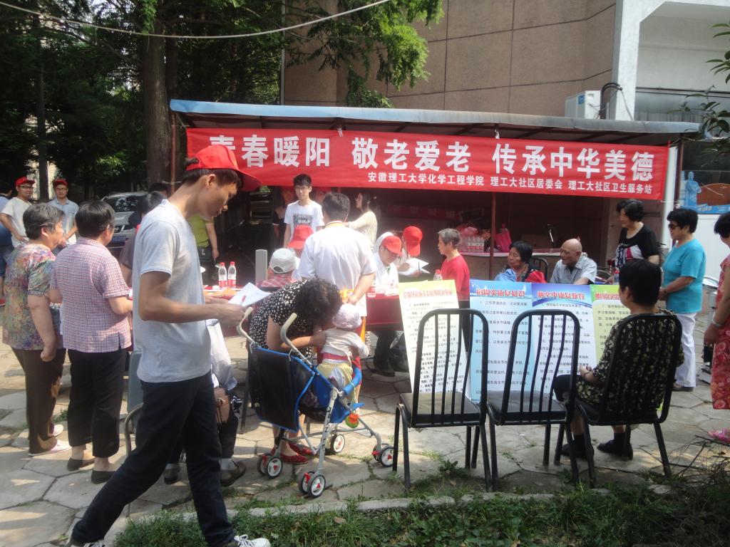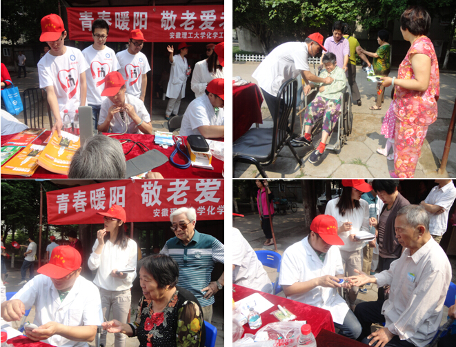 6月4日上午,化学工程蓝色导航 联合理工大社区居委会、理工大社区卫生服务站在本部家属区举行了以“青春暖阳,敬老爱老”为主题的免费为社区老人测血糖血压等健康服务活动。田家庵区卫生局党组书记张晓光、朝阳街道社区卫生服务中心主任卢斌、朝阳街道社区卫生服务站站长张萍、理工大社区居委会主任刘守则、蓝色导航 关工会副主任汪大立、蓝色导航 团委书记曹秀军及暖阳爱老团10余位成员参加活动。