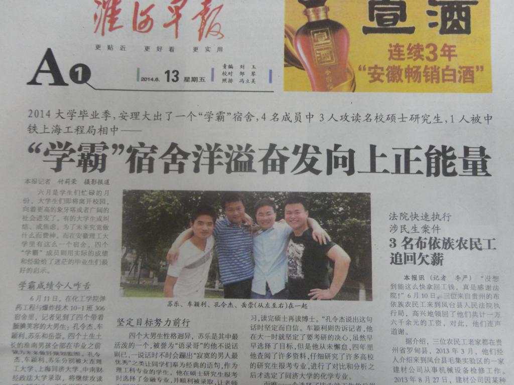 在化学工程蓝色导航 有这样一个“学霸”宿舍,他们同住在高层公寓10306宿舍,4名成员中3人考上名校研究生,1人签约大型国企,他们的事迹一时引起社会的关注。6月13日,《淮河早报》在A1版头条详细报道了“学霸”宿舍“男神”们的奋斗历程,这个榜样宿舍用骄人的成绩为学弟学妹们留下了最好的经验和启示。