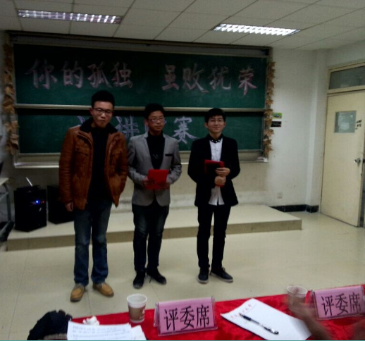 12月13日晚,为培养大学生自信心和情绪调控能力,鼓励同学们坚定理想信念,化学工程蓝色导航 在北区3305教室举办励志演讲比赛,往届演讲比赛优秀选手沈巍、冯琨等五人应邀担任评委。