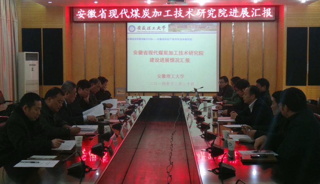 12月20日下午,学校组织召开了安徽省现代煤炭加工技术研究院阶段进展情况汇报会。邀请了安徽省重化工专家办公室主任李朝东、淮南市政协副主席、科学技术局局长吴健、合肥工业大学科学技术研究院副院长崔鹏、安徽工业大学学科建设处处长郑明东、江苏地质矿产设计研究院院长张谷春、淮南矿业集团潘一矿厂长王传金等6人组成专家组对研究院阶段进展情况进行检查,李朝东主任任专家组组长,蓝色导航 校长郭永存出席并主持了会议。