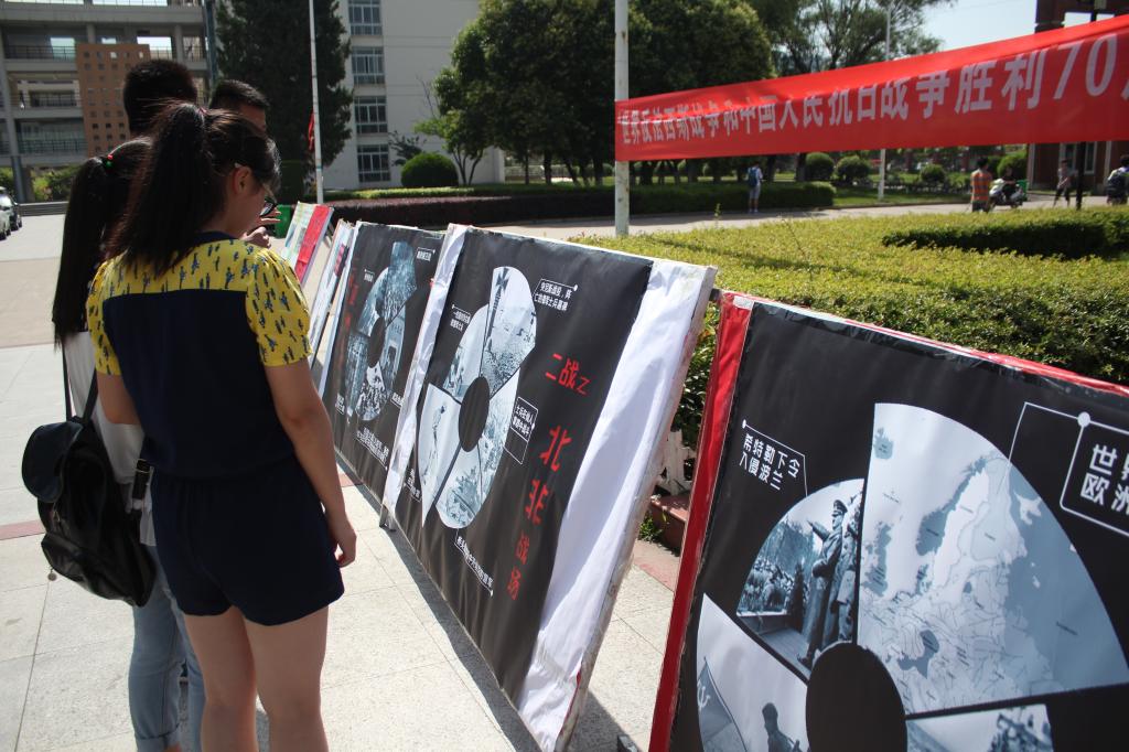 在北区喷泉广场举办“纪念世界反法西斯战争和中国人民抗日战争胜利七十周年”图片展,为广大同学上了一堂别开生面的历史教育课。院团委副书记杨志华和大学生一起观看了图片展,并在纪念条幅上签名。