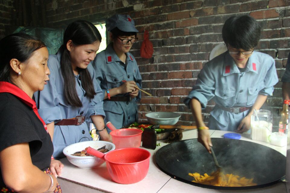 赴井冈山实践团实践身着红军装、佩戴步枪,井冈山教育基地带班老师廖诗琴的带领下,走进井冈山农户家中自制红军餐,重温鱼水情;重走朱毛挑粮小道,体验革命艰辛之路。