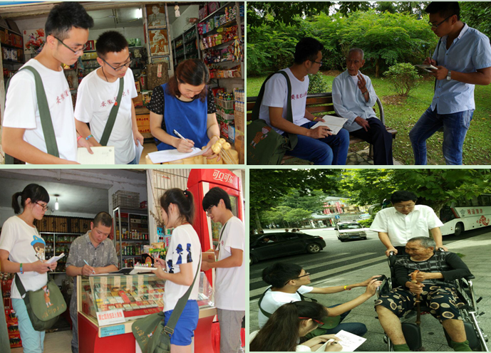走出博物馆,同学们顾不上休息,顶着骄阳按事先安排分成六组,迅速前往预指定地点开展调研工作。本次调研采取填写调查问卷和咨询座谈相结合的形式进行,通过对不同层次民众的口述历史进行记录与整理,力争获取最全面,最真实的一手材料。调研中,同学们三人一组,分别负责摄像,记录与询问工作。由于事先准备充分,分工明确,当天下午的调研取得很好的效果。从学员初步反映情况来看,本次寻访对象有游客、当地老裱、商店老板、退伍军人、交警、学生、在职人员等各行各业的民众,年龄也从21岁到75岁不等,所发50张调查问卷全部收回,达到了预期的效果。