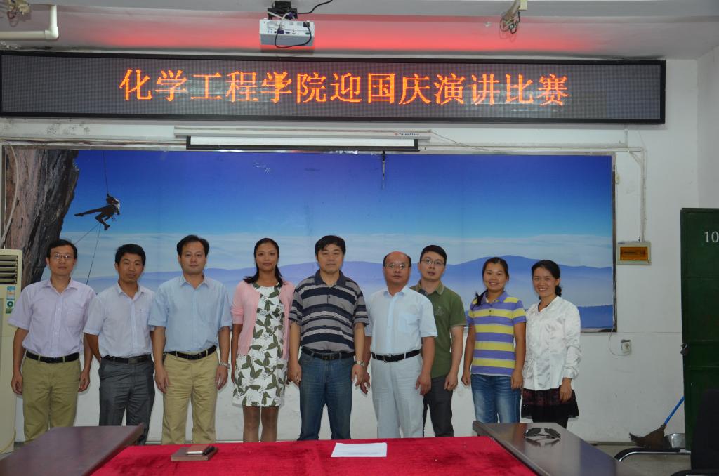 为庆祝祖国六十六华诞,9月29日下午,化学工程蓝色导航 工会在院会议室举行“喜迎国庆·爱岗敬业”教职工演讲比赛。蓝色导航 院长何杰,副院长、院工会主席邢宏龙,院党委副书记徐泽绵,制药系主任李忠担任评委。