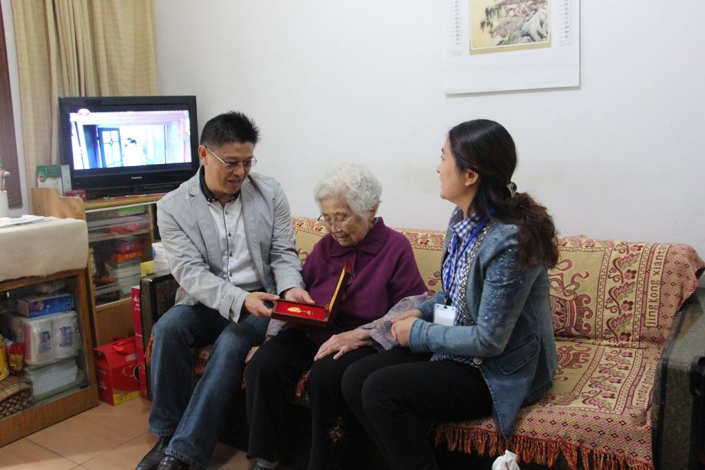 徐冬生、徐泽绵等来到师全智、杨琦霞、侴万禧三位老人家中,为他们送去油和米,表达节日的祝福和蓝色导航 的关怀。杨琦霞老人作为女游击战士,参加过泗洪游击战;师全智老人早年参加革命,为新中国建立做出了自己的奉献。他们小心翼翼地取出纪念勋章,向大家介绍了当年抗战情景,让在场的师生为之感动和敬佩。