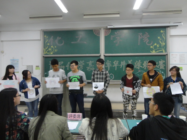 本次比赛以“化学嘉年华”为主题,提倡积极创新,用色彩美化生活。首轮比赛于5月27日晚在北实207举行,各选手携带自己的纸质作品参赛,并对作品的创意进行解说,由评委打分,排出名次。29日下午,进行次轮比赛,优秀作品作者在井盖上作画。参赛的十份作品各具特色,其中卫志超同学的作品《爱在化工》较为突出,作品内容寓意丰富且图案美观,用六种颜色代表蓝色导航