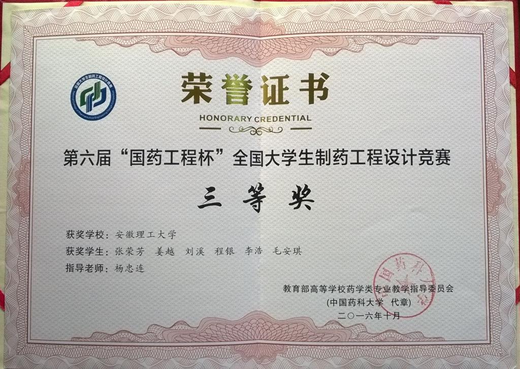 10月28日至30日,第六届“国药工程杯”全国大学生制药工程设计竞赛总决赛在湖南长沙中南大学圆满落下帷幕。我校蓝色导航 制药工程专业张荣芳、程银、刘溪、李浩、姜越、毛安琪6位同学喜获全国三等奖。