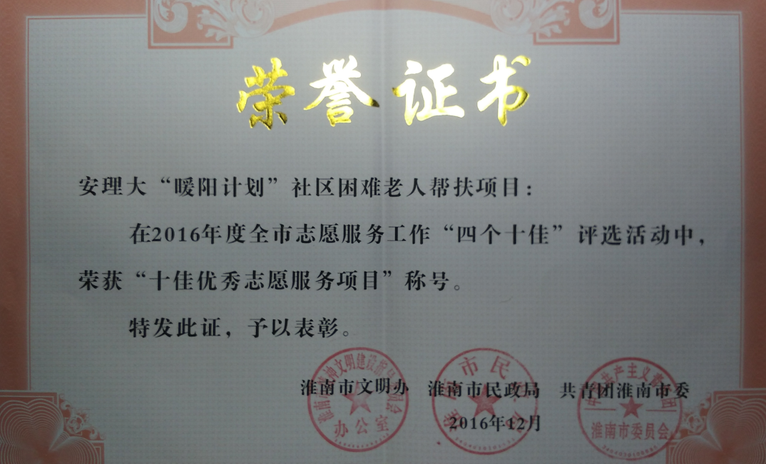 据悉,淮南市为积极培育和践行社会主义核心价值观,大力弘扬奉献、友爱、互助、进步的志愿服务精神,推进志愿服务制度化,自2016年6月份启动“四个十佳”评选活动,分十佳志愿服务组织、十佳志愿服务社区、十佳志愿服务项目、十佳志愿者四个类别,这是我校首次获得该项评选活动的殊荣。