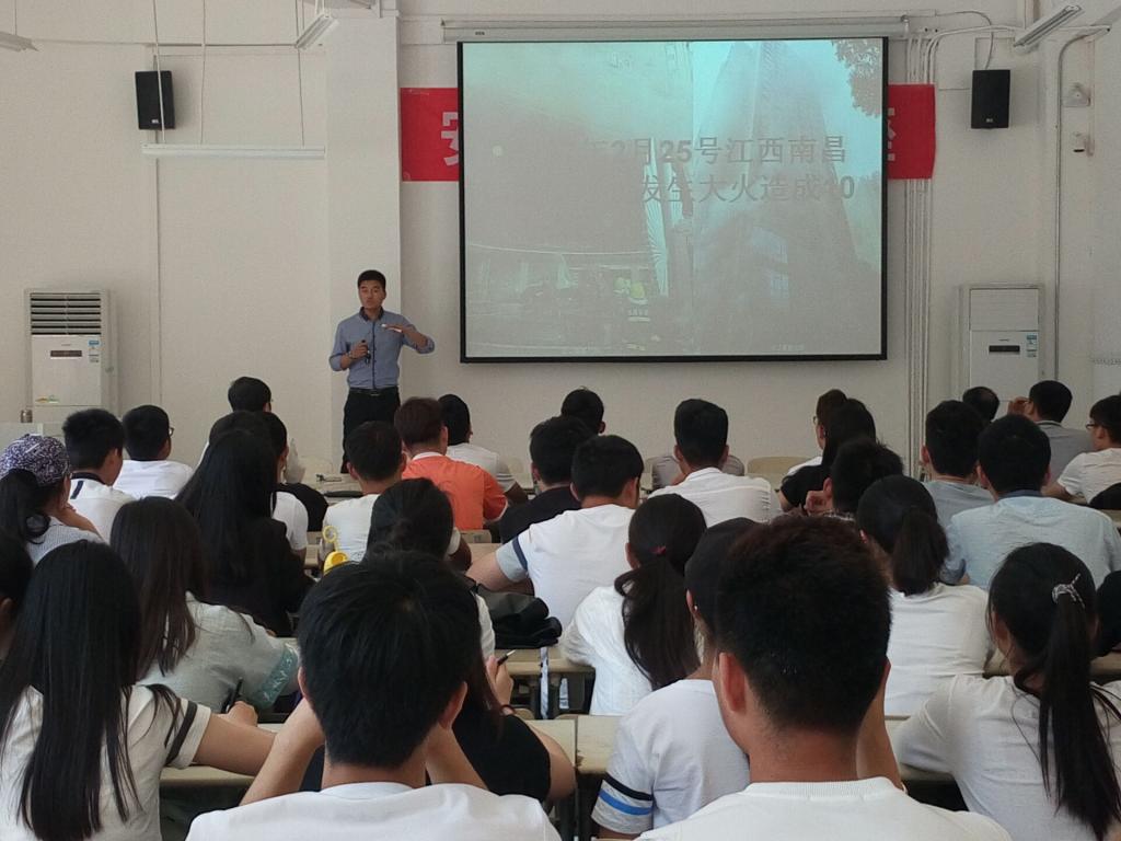 杨维超以“珍爱生命,远离火灾”为题,通过近年来各地发生的火灾、化工厂爆炸等事件介绍火灾的危害性,提醒师生发生火灾时要以保住生命为前提,及时采取躲进房间、远离火源、拨打火警电话等应急措施;同时指出安全用电的重要性,提醒学生避免用电不当而造成宿舍失火。最后,他还现场向同学们演示了防火面罩佩戴、灭火器和防火毯的使用方法。