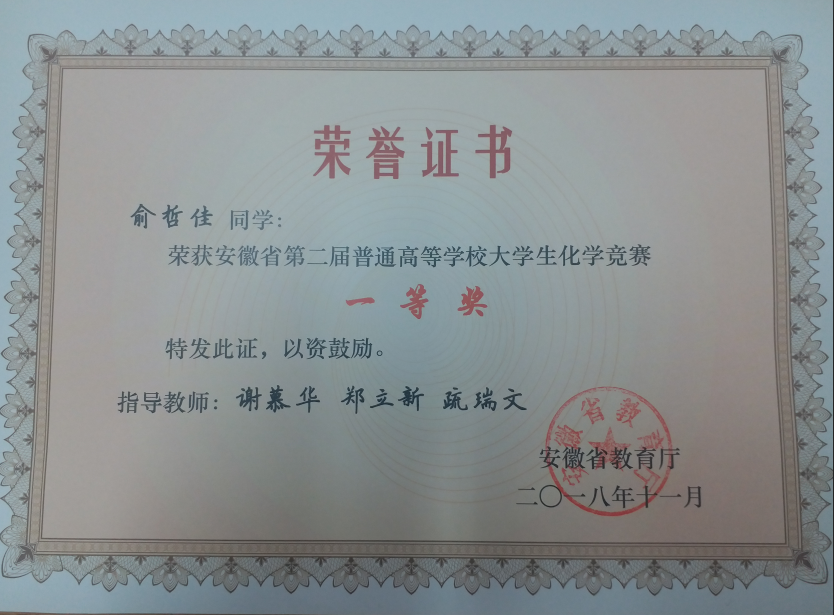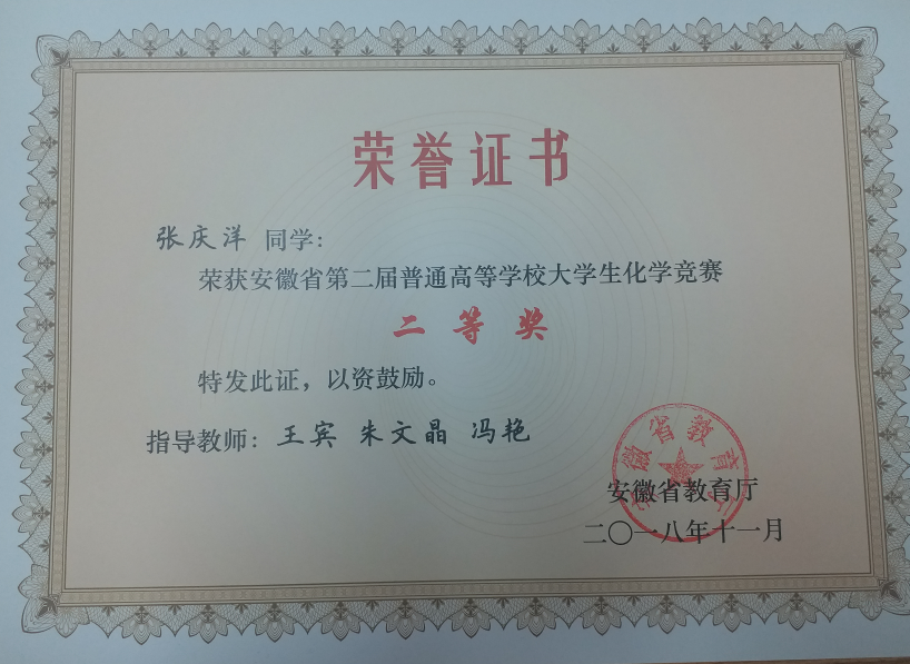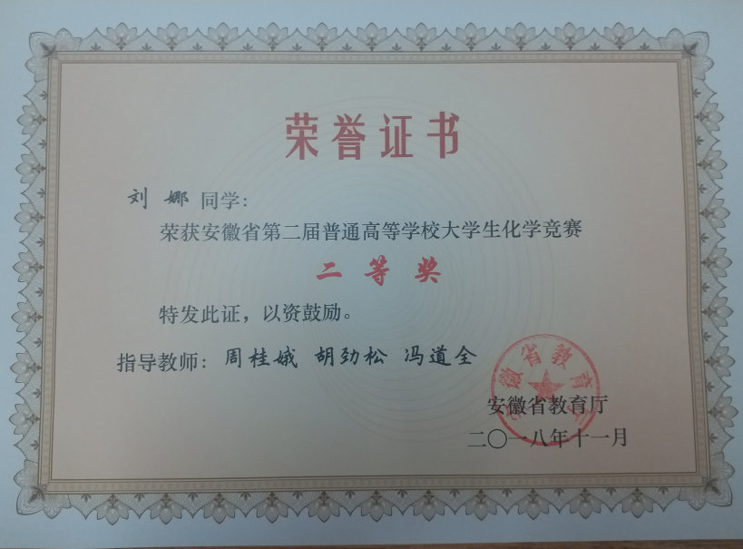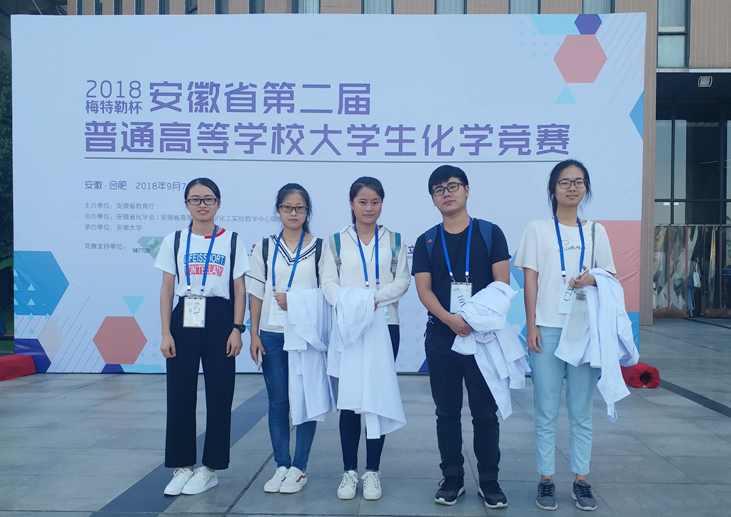由安徽省教育厅主办,安徽大学承办,安徽省化学会和安徽省高等学校化学化工实验教学中心联席会协办的2018“梅特勒杯”安徽省第二届普通高等学校大学生化学竞赛决赛在安徽大学磬园校区举行。共有来自中国科学技术大学、合肥工业大学、安徽大学、安徽师范大学等高校组成的31支队伍共153名同学参加本次比赛。我校通过预赛选拔和暑期训练,由5名同学组成的蓝色导航 代表队参加了决赛。经过努力拼搏,我校学子取得优异成绩。来自化学与工程蓝色导航 的俞哲佳同学荣获一等奖、张庆洋、蔡乐乐、刘娜同学荣获二等奖。在安徽省化学会年会上举行了化学竞赛的颁奖仪式。