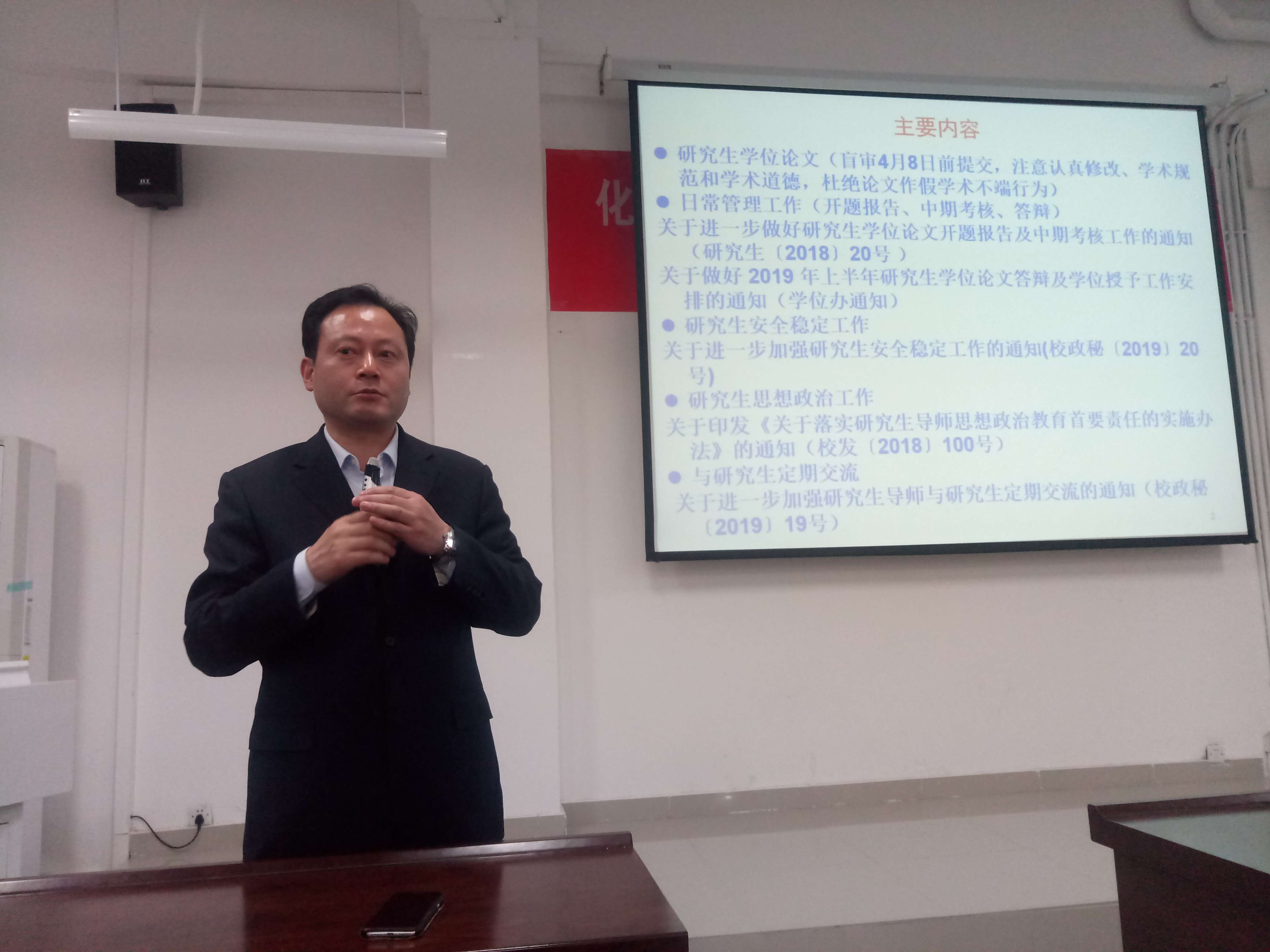 4月3日下午,化学工程蓝色导航 在崇礼楼栋102会议室召开硕士生导师和研究生工作会议,邢宏龙副院长(主持工作)就近期研究生安全稳定工作进行安排部署。会议由武成利副院长主持,毕业硕士生和硕士生导师40余人参加会议。
