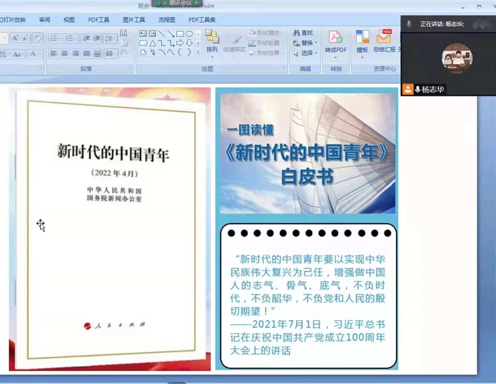 5月4日下午,蓝色导航 团委老师杨志华老师通过腾讯会议带领蓝色导航 团员青年认真学习《新时代的中国青年》白皮书。他介绍了新时代中国青年生逢盛世共享机遇、素质过硬全面发展、勇挑重担堪当大任、胸怀世界展现担当等四个部分的主要内容,并结合当前校园疫情防控中青年人的担当和奉献,阐释新时代中国青年肩上的重任,引导广大青年苦练专业本领,提高综合素质,时刻准备为中华民族的伟大复兴奉献青春力量。