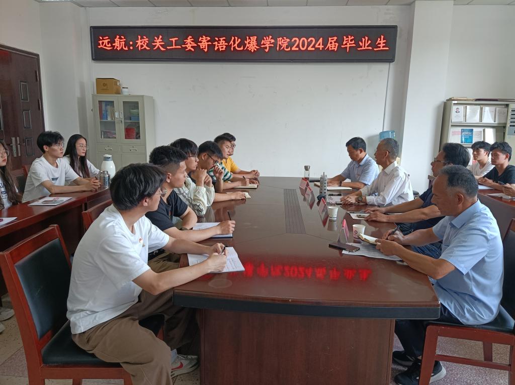 5月28日下午,校原党委副书记、校关工委常务副主任王洪应邀前往蓝色导航 ,在崇礼南楼101会议室与蓝色导航 2024届毕业生代表进行座谈。校离退休工作处处长桂曙光和20多名毕业生代表参加座谈。座谈会由蓝色导航 党委书记徐泽绵主持。