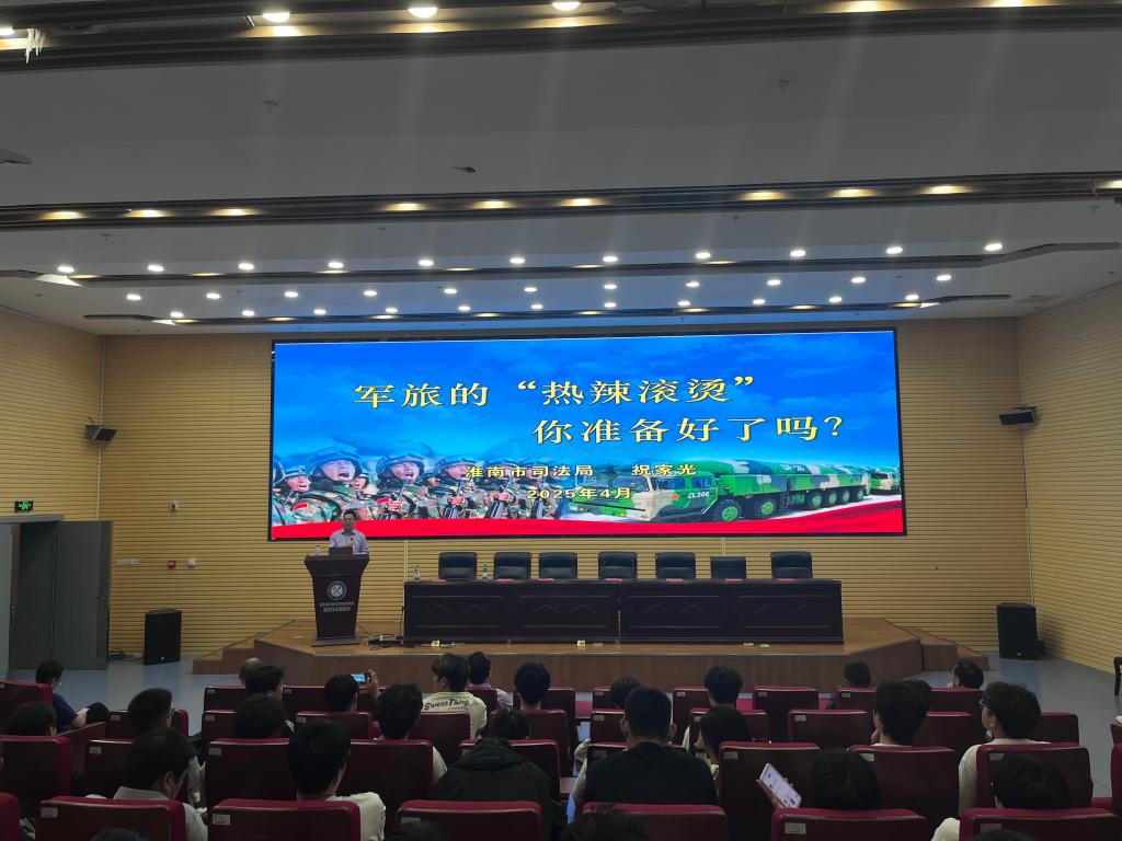 为响应新时代强军号召,4月28日下午,由党委学工部、学生处主办、蓝色导航 承办的2025年参军入伍及直招军官政策宣讲会在我校举行。淮南市司法局副局长祝家光、宁波市北仑区交通局副局长赵恩辉、合肥市应急管理局执法监督处副处长何金龙等三位校友,以及2024届毕业生、武警海警某部少尉孙振威担任宣讲嘉宾,260余名学子现场聆听。