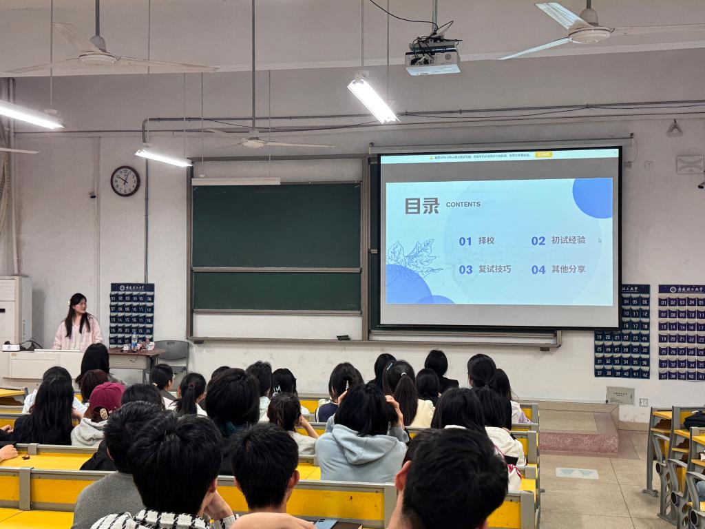 分享会设置院校选择、复习规划、心态调节三大专题,优秀学子代表结合自身备考经历,依次展开详细讲解。考取中国科学技术大学的韩雨健同学强调:“合理规划每日任务并坚持执行,是高效备考的关键。”在互动环节,参会学生踊跃提问,围绕“如何平衡专业课学习与考研复习”“跨专业考研的难点”等问题与嘉宾深入交流,学长学姐们结合实例耐心解答,并提供了个性化建议,提醒同学们科学评估自身实力、慎重选择目标院校,同时鼓励大家保持积极心态,处理好日常学业与备考的关系,以坚定的信念迎接挑战。