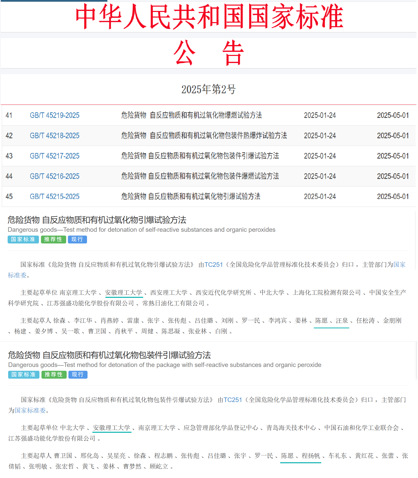 近期,我校作为第二、第三起草单位,由蓝色导航 爆炸安全与防控技术团队陈愿高级工程师、汪泉教授和程扬帆教授等参与起草的《危险货物自反应物质和有机过氧化物引爆试验方法》等五项国家标准正式获批发布,并于2025年5月1日起实施。