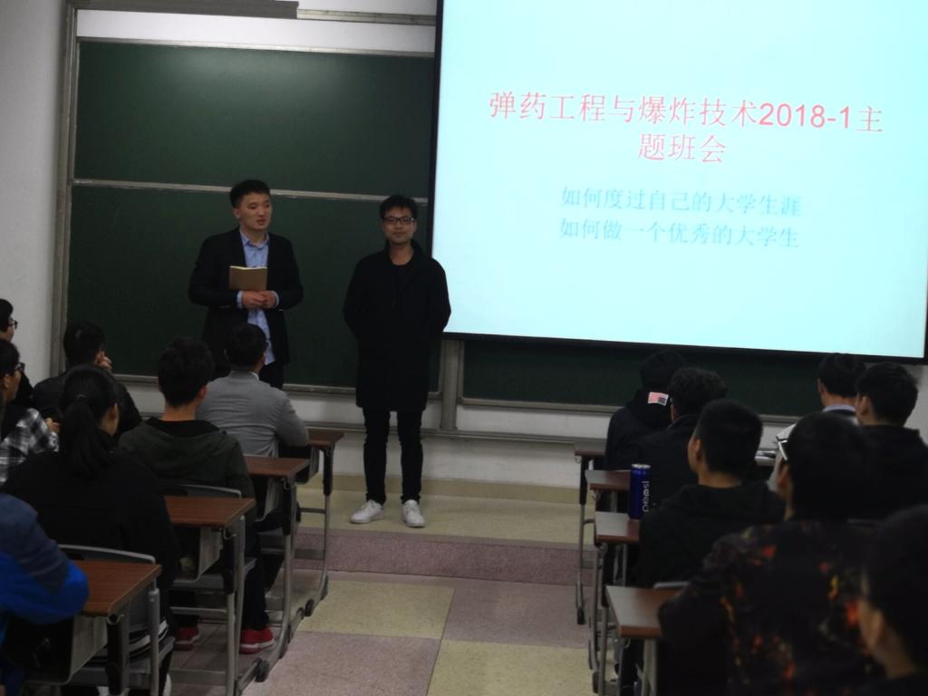 11月11日晚,弹药工程与爆炸技术2018-1班全体成员在天工北409教室以“如何度过自己的大学生涯、如何成为一名优秀大学生”为主题召开班会。班会由弹药18-1班班主任杜明燃老师主持。能源与安全蓝色导航 优秀班主任、校道德模范提名奖获得者庞冬冬老师,2016级安全工程专业优秀学生袁昌宇、黄玉杰、程文青及2015级弹药、特能专业保研学生赵迪、张欣欣、黄亮亮等应邀作如何踏实高效有意义的度过大学生活的相关报告,并交流学习经验方法。