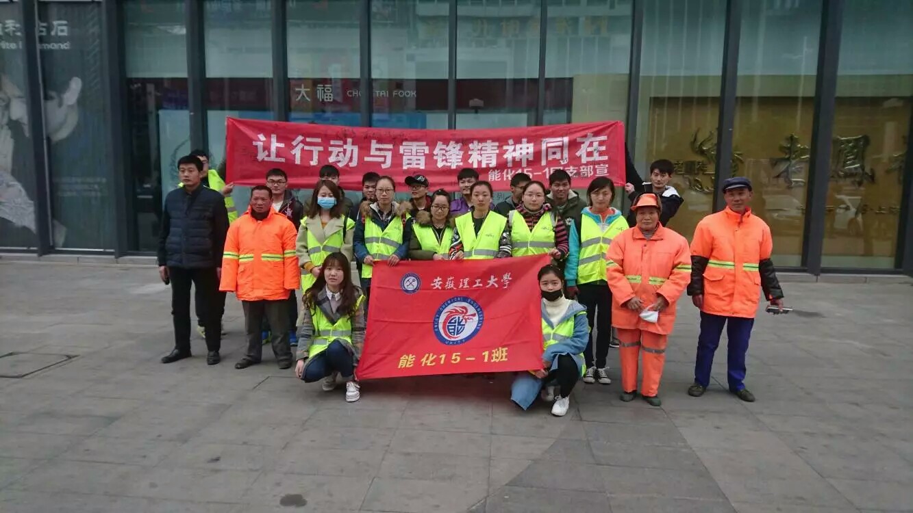3月19日下午,能化15-1班团支部18名志愿者,在淮南市环卫局负责人刘先生的带领下来到龙湖南路开展“关爱环卫工人,双手传雷锋情”志愿服务活动,帮助城市的环卫工人清理垃圾,使雷锋精神传递到每个人的心中。