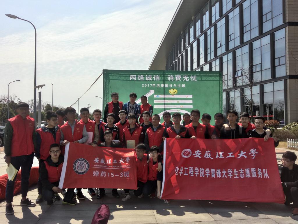 3月15日上午,弹药15-3班团支部32名志愿者在淮南市高新区工商分局、质监局和烟草局等部门的带领下,在山南政务中心西侧广场开展主题为“网络诚信,消费无忧”的消费者权益法宣传活动。本次共发放“消费者维权手册”1500册。
