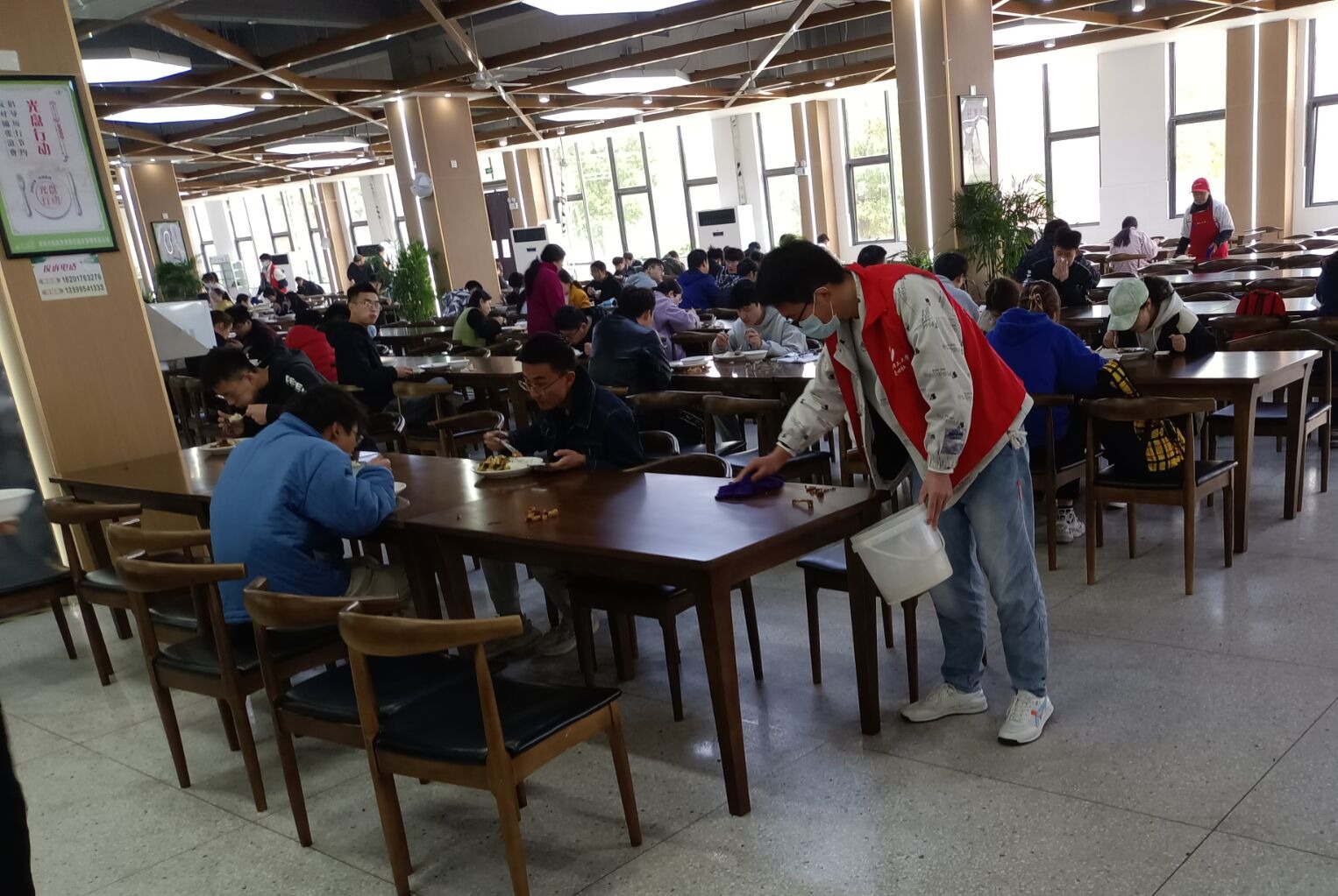 3月7日中午,志愿者们在义苑食堂一楼帮忙收拾餐桌,为同学们就餐提供便利,并以发传单的形式宣传“光盘行动”。以实际行动践行志愿者精神,用志愿者行动宣传雷锋精神,让雷锋精神照亮他人。