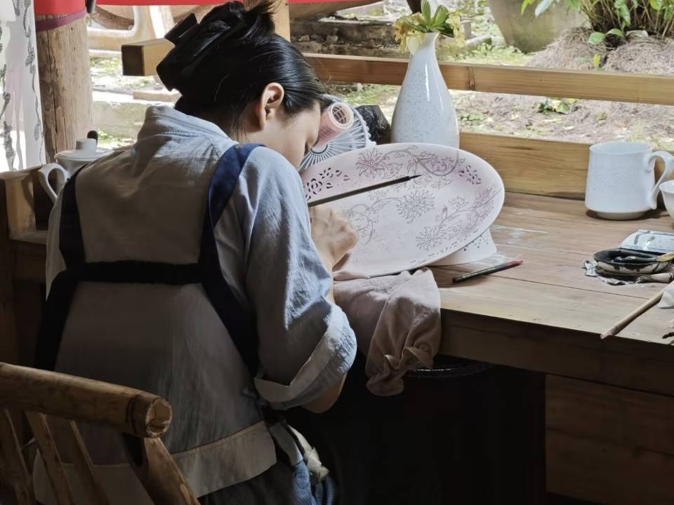 在陶阳里古韵悠长的街巷中,志愿者们被一间素朴作坊里凝神专注的身影所吸引。非遗传承人端坐于工作台前,正全神贯注于一件素坯的绘画。志愿者们屏息凝神,在大师指尖与素坯无声的对话里,深切感知到“一生只为一事来”的匠人精神。