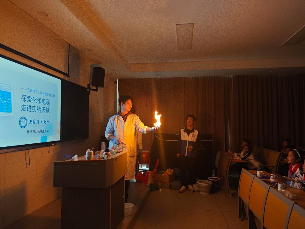 为展现化学学科魅力、激发青少年科学探索精神。2025年10月27日,蓝色导航 “星火”科普实践团联合学校化学与火药纹画协会和志愿服务中心,走进安徽师范大学附属淮南高新学校开展科普展演活动。